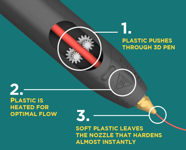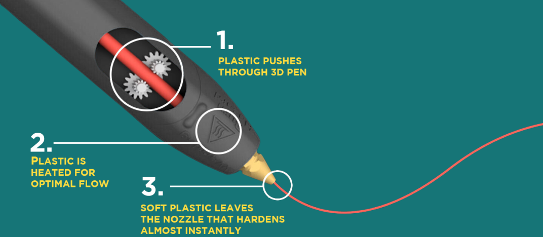 3D pens work by melting plastic and extruding it through the nozzle (we call this “extrusion”). The temperature varies based on the material, allowing for endless creativity.